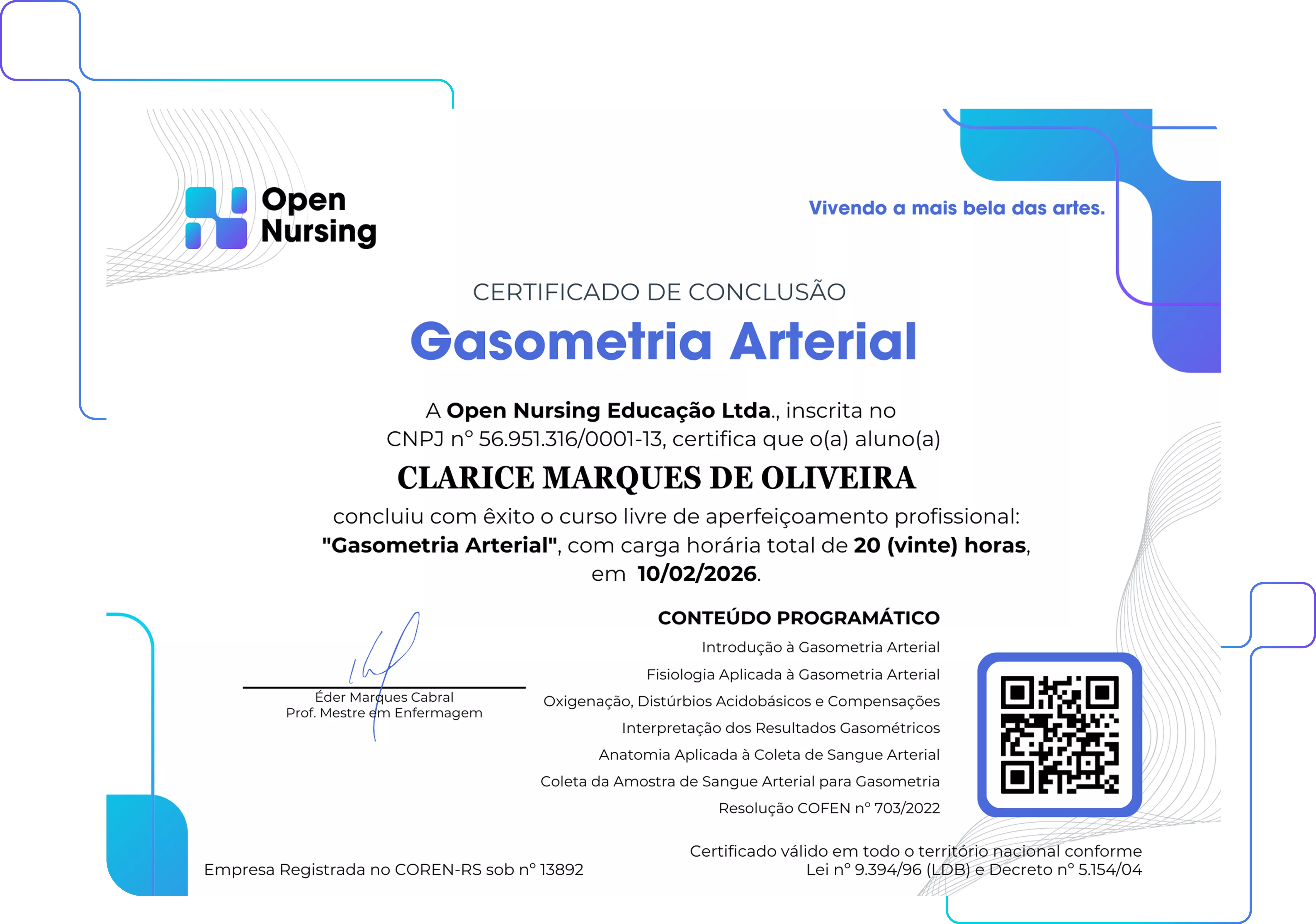 Sim. Ao concluir o curso, você recebe um certificado de capacitação em Gasometria Arterial, que comprova sua participação e o conteúdo estudado.